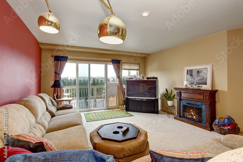 Modernized Living Room With One Red Wall And Fireplace